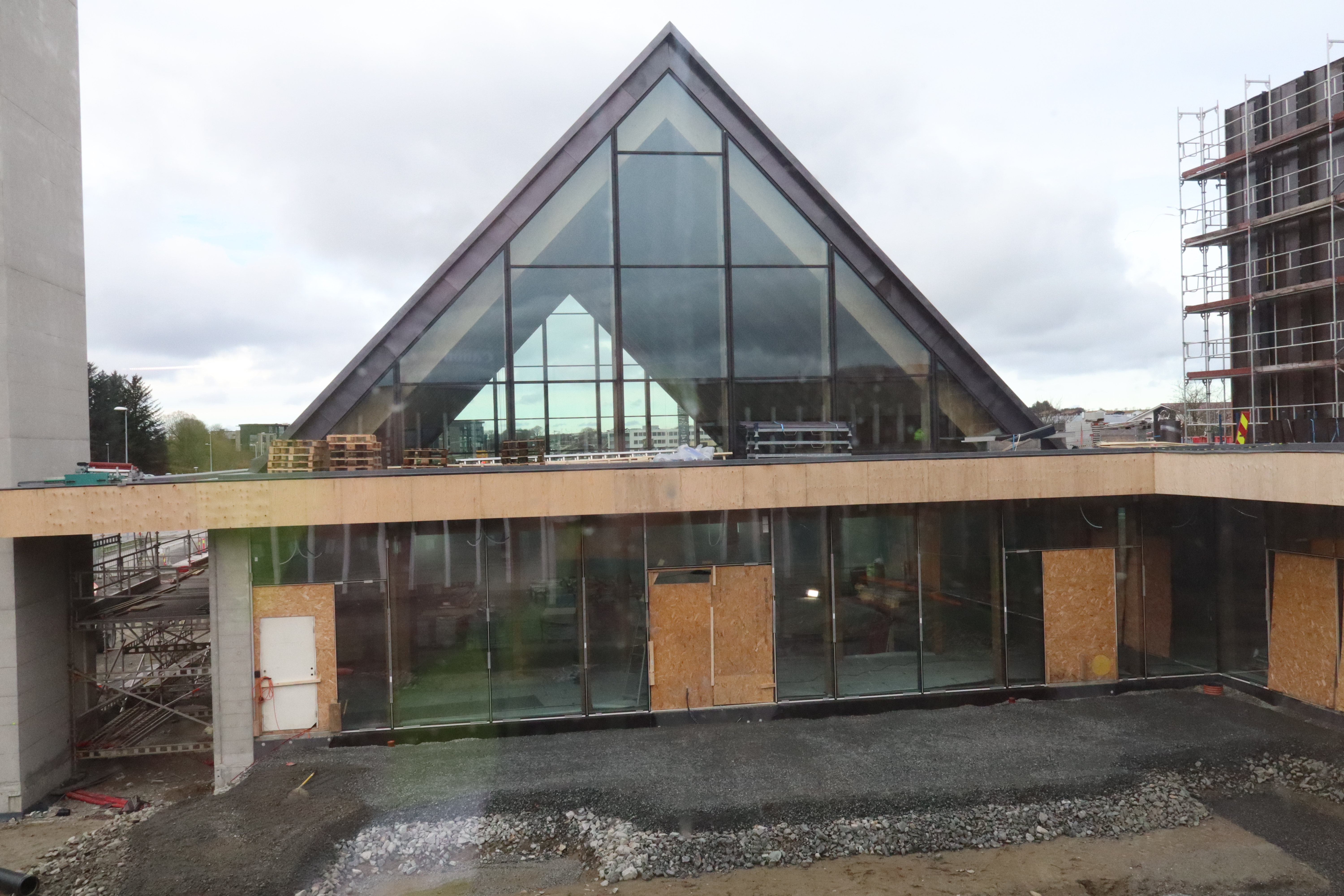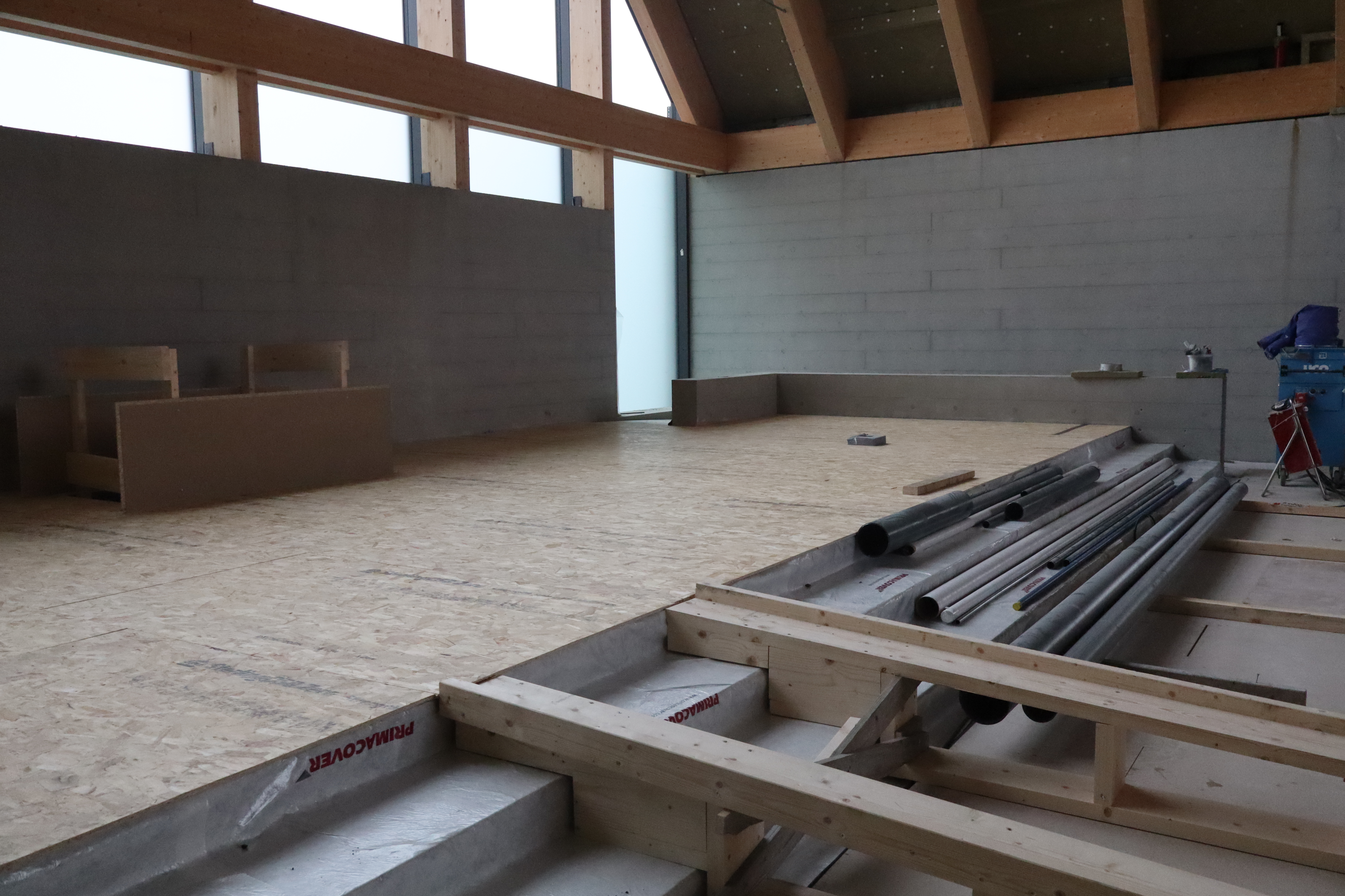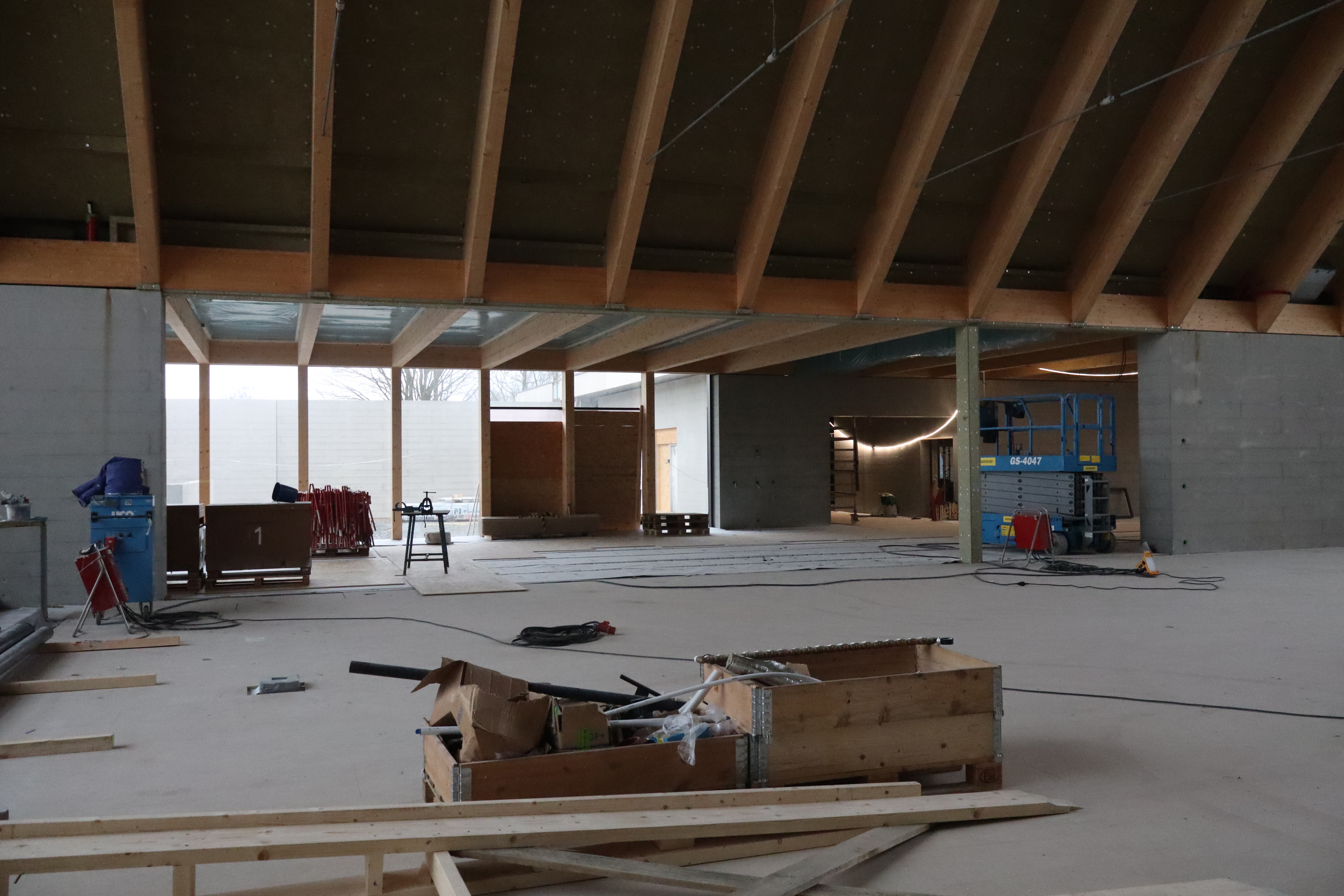 Utsikt inn mot aktivitetssalen. Her vil det kome foldedør med høve til å lukka av mellom kyrkja og aktivitetssalen.